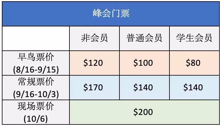峰会网上售票的基本票价是$170,现场售票为$200。购买早鸟票及会员身份购票,均会享受不同程度的优惠折扣。详情如下: