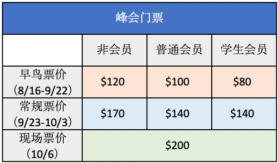 峰会网上售票的基本票价是$170,现场售票为$200。购买早鸟票或以会员身份购票,均会享受不同程度的优惠折扣,详情如下: