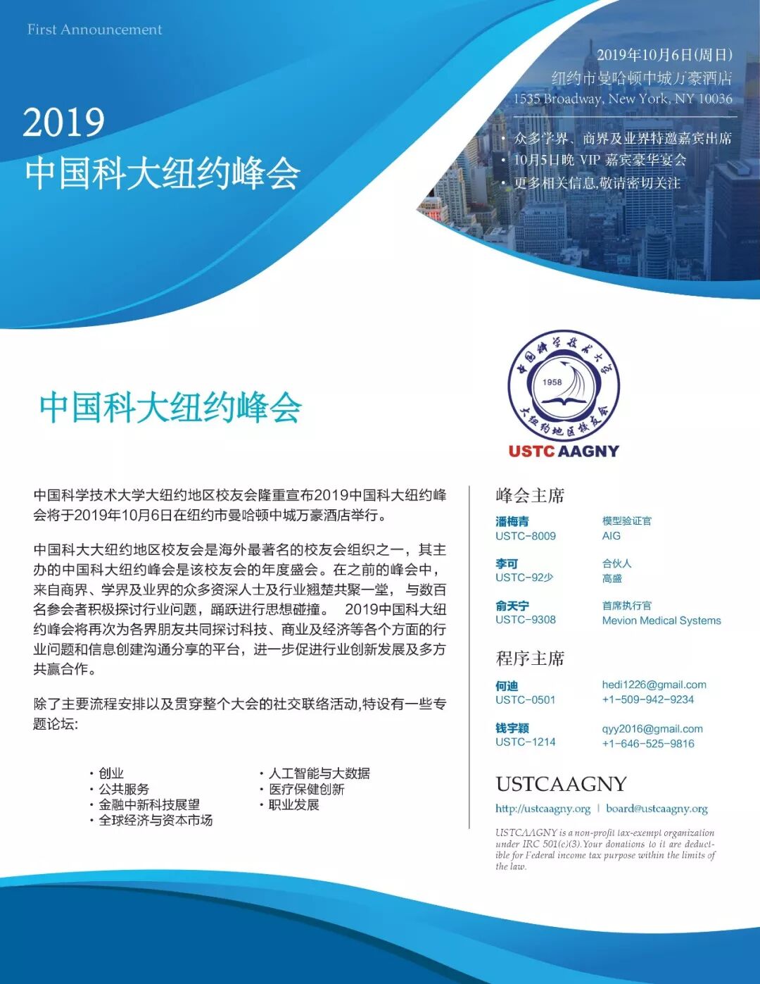中国科学技术大学大纽约地区校友会隆重宣布2019中国科大纽约峰会将于2019年10月6日在纽约市曼哈顿中城万豪酒店(New York Marriott Marquis)举行!