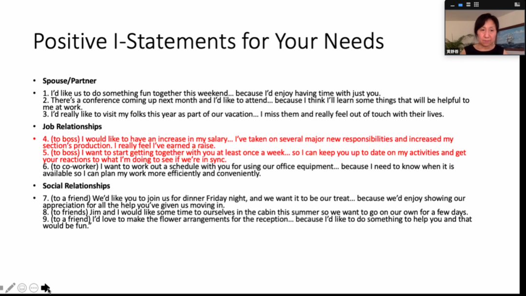 最后一个“I”是I-statement,即要多采用“我”如何如何的陈述来表达自己的诉求。黄静蓉校友随后举了这个例子: