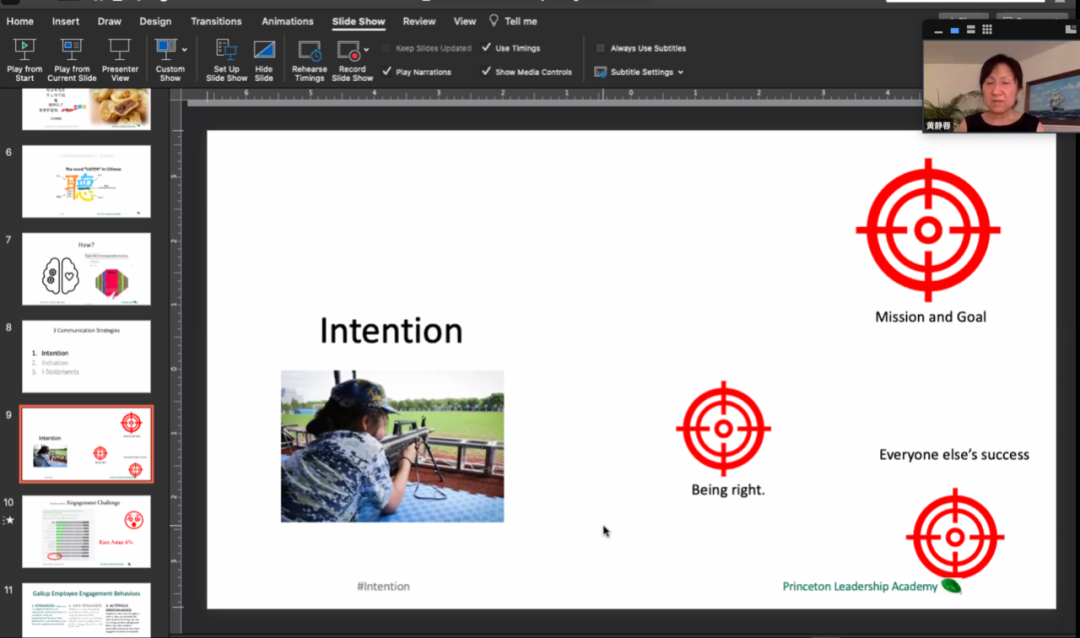 随后黄静蓉校友开始进入正式干货讲座,由”三I”引入—即Intention,Inclusion和I-statement。黄静蓉校友之后分别对这三个方面抽丝剥茧,娓娓道来。首先是Intention,她提到我们做事情要先问自己“What’s my goal/purpose?”,然后做出自己的key decision。如果目标是有效的communication,那么我们就需要用心听,看着对方的眼睛,然后用心交流。在online沟通的情况下,一个很有效的办法就是打开摄像头。然后黄静蓉校友以Gallup提出的有关工作中如何engaging的建议进行具体解释,其中很重要的一条就是要在公司发挥自己的influence,这需要我们将自己的goal与公司的goal合二为一进行思考整合。听到这里很多校友都点头表示赞同。