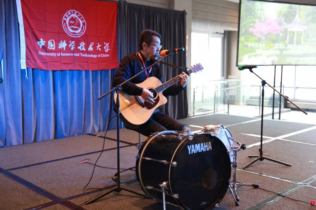 随后张迎潮校友的一人乐队给大家带来了《合肥》,唱出了回忆,唱出了思念。自弹吉他,自吹口琴,自打架子鼓,自唱歌曲,一人组成一个乐队的形式,让大家眼前一亮,想不到张校友是如此的潇洒,情不自禁跟着鼓掌,叫好!