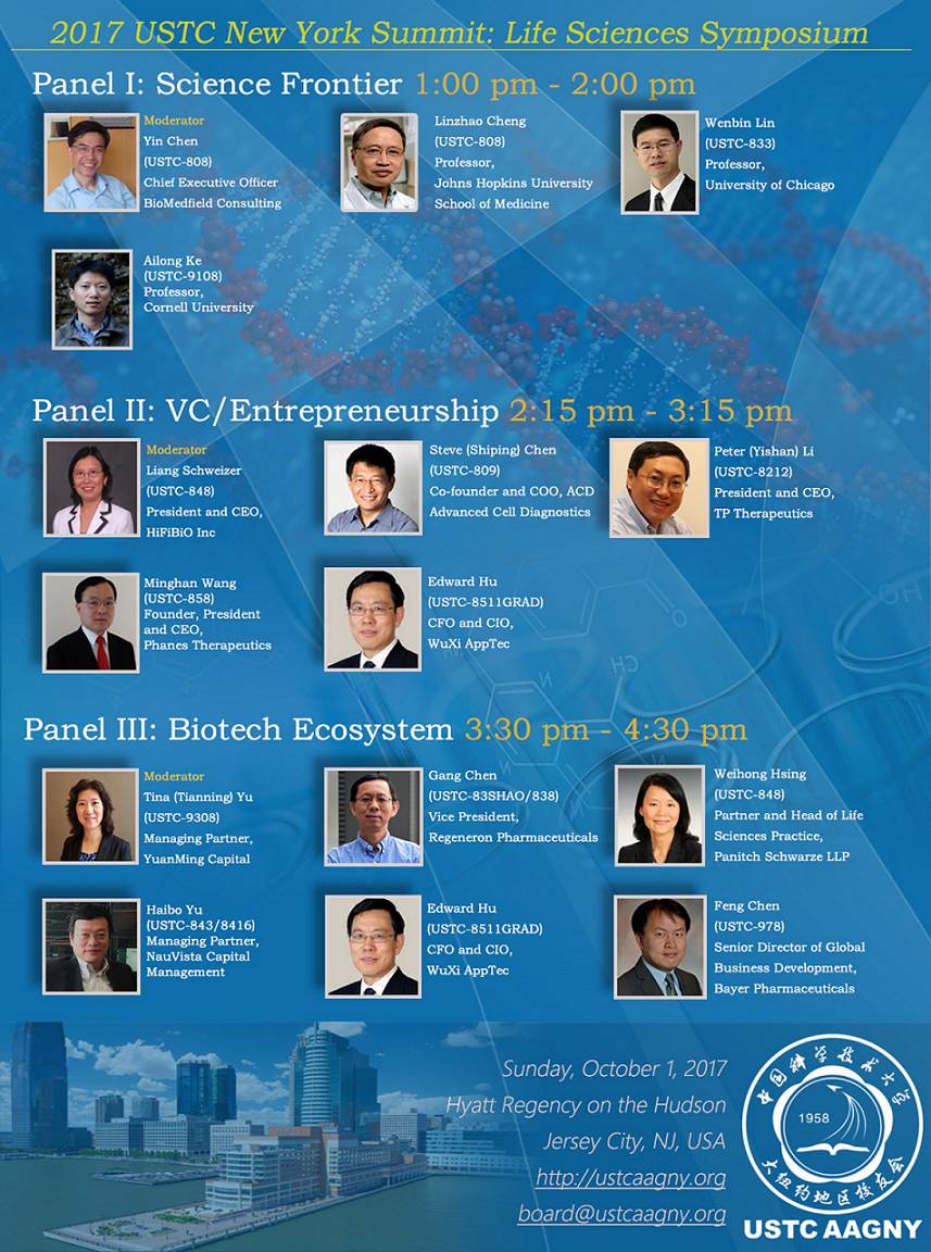 秋风送爽,丹桂飘香。首届中国科大校友生命科学研讨会,作为2017中国科大纽约峰会之分会,于10月1日在新泽西州泽西城的凯悦酒店成功举办。本次研讨会的主席由陈寅(808) 博士和俞天宁(9308) 博士共同担任。