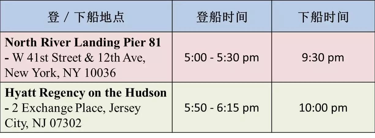 特别提示:9月30日Cruise晚宴的登(下)船地点和时间如下图,请大家根据自己的住宿和行程安排选择合适的登(下)船地点和时间,峰会将派专人在两个登船地点设立登船处,方便大家登船: