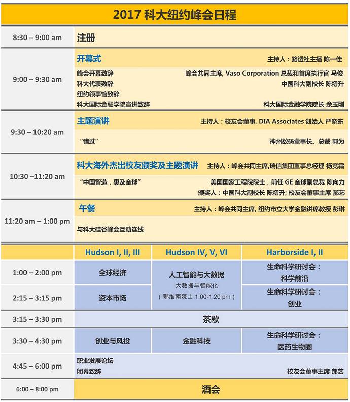 2017中国科大纽约峰会基本议程如下图(如有变动,请以最新资料为准):