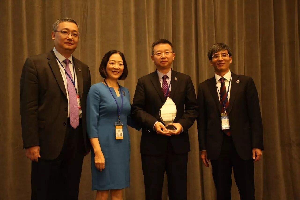 海外杰出校友演讲前,中国科大陈初升(783)副校长,校友会董事会主席郝艺(835)校友和峰会共同主席,校友会董事杨竞霜(86少)校友共同向陈向力(802)校友颁发了2017年度中国科大海外杰出校友奖。